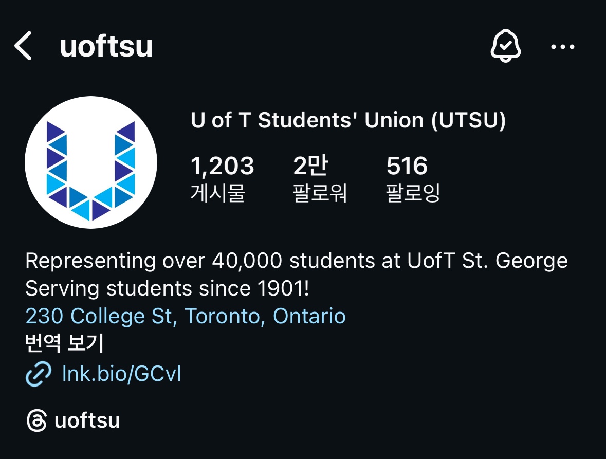 토론토대학교 학생 연합 계정인데요. 저는 파견기간동안 정말 유익하였답니다.