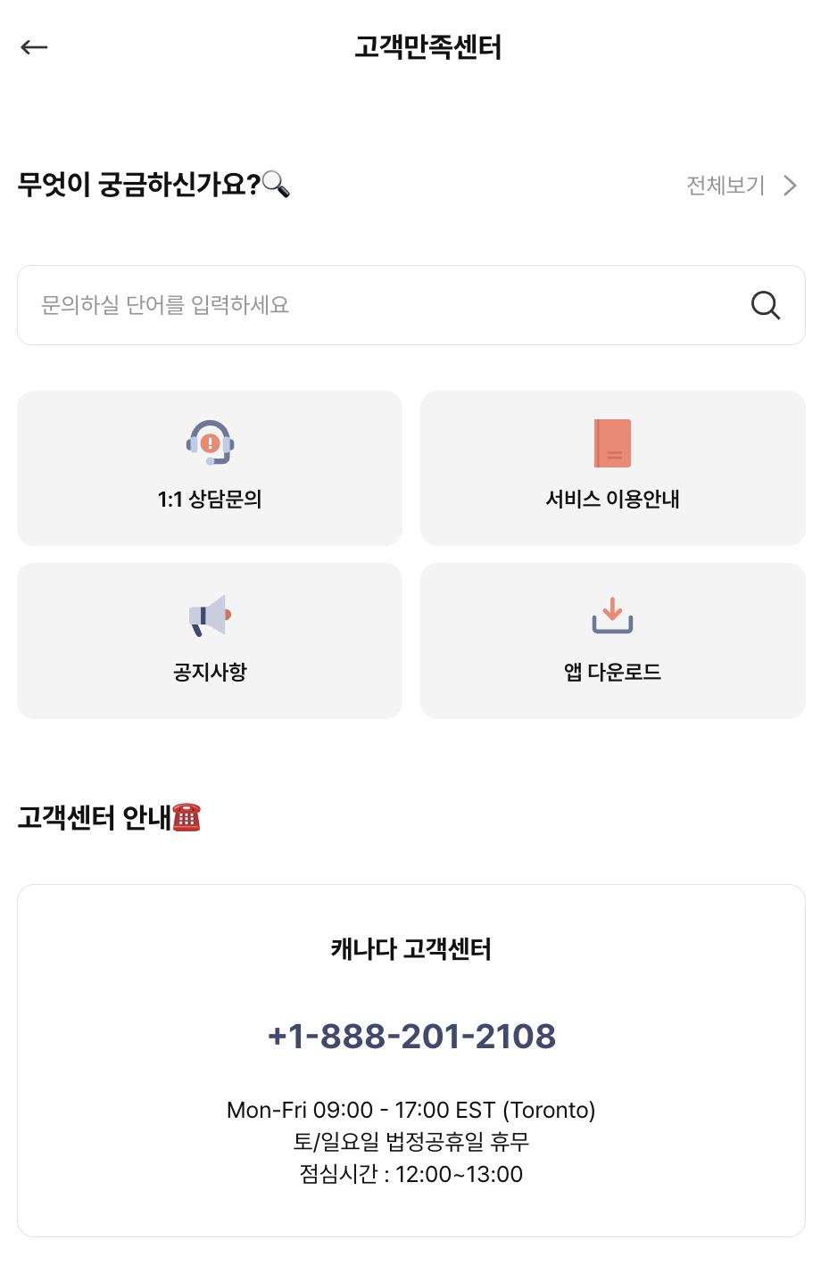 앱으로 1:1 상담문의를 하시거나, 캐나다 현지 번호 중 편하신 방법으로 문의해주시면 됩니다 :)