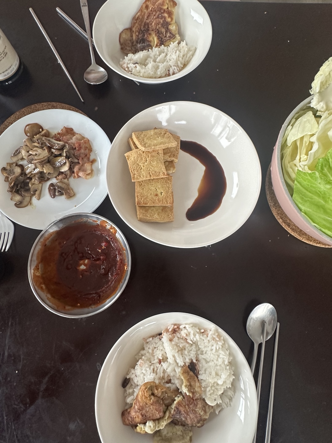 어제 먹다가 남은 닭과 함께 아침을 먹어주었구요.