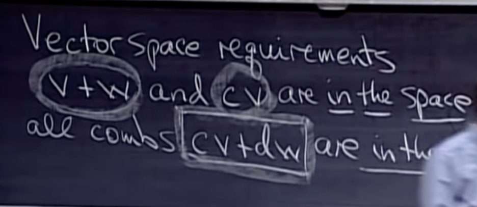 A vector space is a collection of vectors which is closed under linear combinations. In other words, for any two vectors v and w in the space and any two real numbers c and d, the vector cv + dw is also in the vector space. A subspace is a vector space contained inside a vector space.