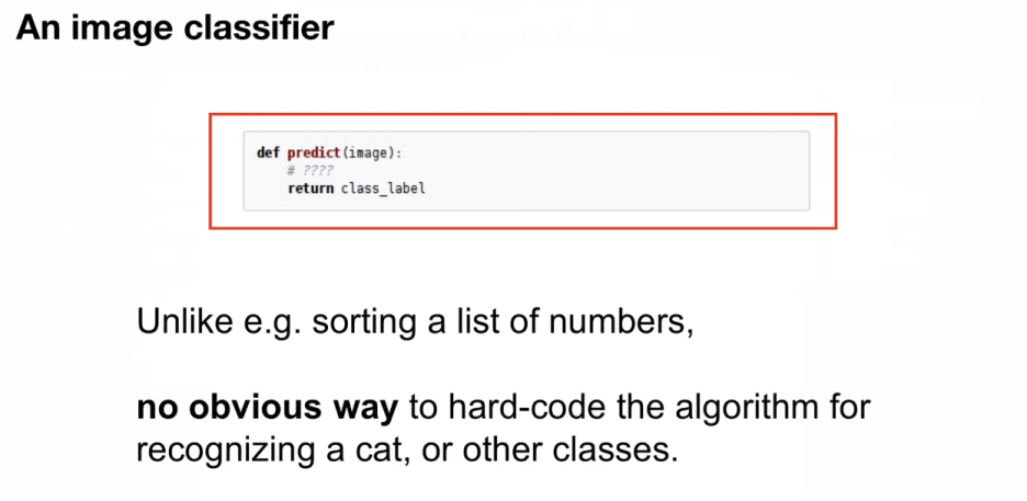 *주의 : 어떤 숫자를 정렬하는 것과 같은 알고리즘과는 다르게 고양이 같은 class로 인식하는 하드 코딩하는 알고리즘이 존재하지 않는다. 따라서, 역사적으로 오랜 기간동안 시도가 되어져 왔다.