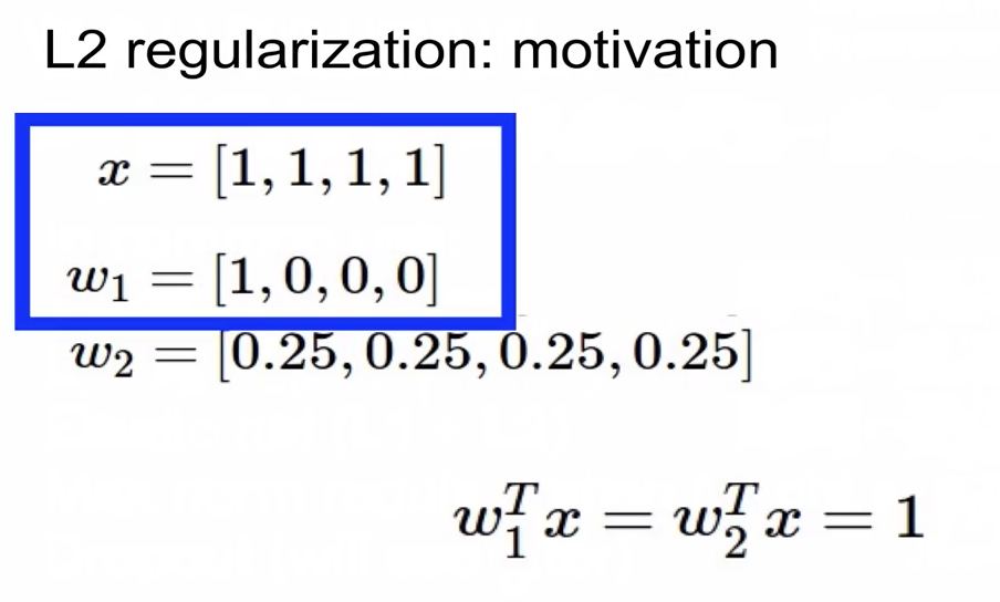 그래서 L2 regularization은 weight을 최대한 spread out해서 모든 Input 고려하기 원한다.(diffuse over everything)