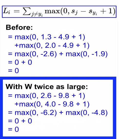 regularization loss의 경우에는 데이터와 상관이 없다. 즉, weight만의 함수다. (weight에만 영향을 받는다.)