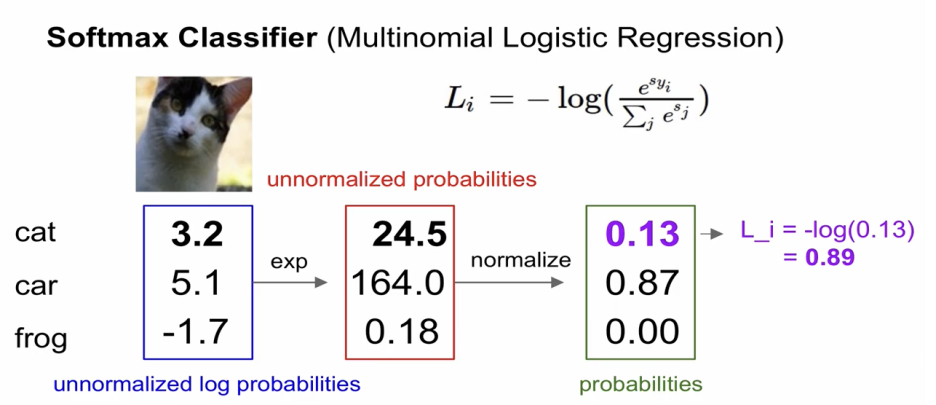 제대로된 class에 대한 log의 확률을 최대화 하고자 하는 것.(정확한 class의 -log 확률을 최소화 하자는 것)