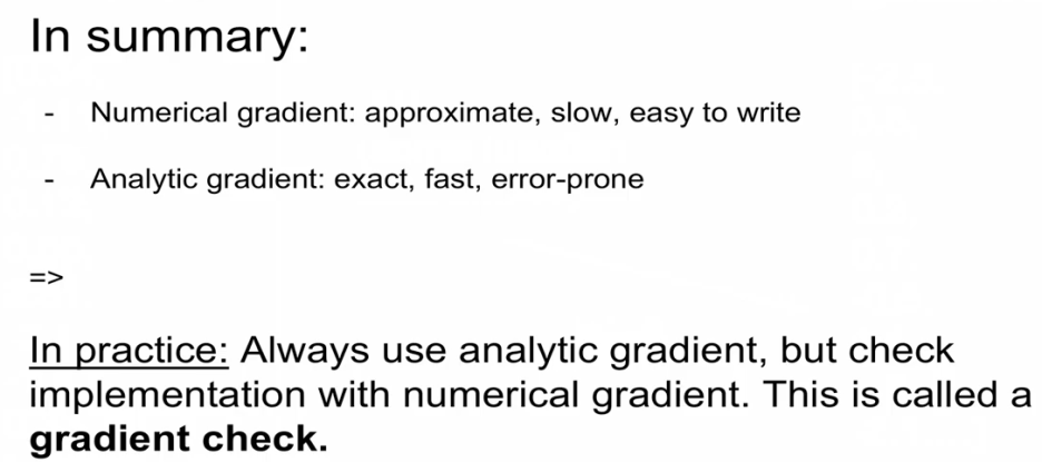 실제로는 analytic gradient만 사용한다. 다만, 계산이 정확히 되고 있는지 검토하고자 numerical gradient를 활용한다. 이러한 체크하는 것을 gradient check라고 한다.