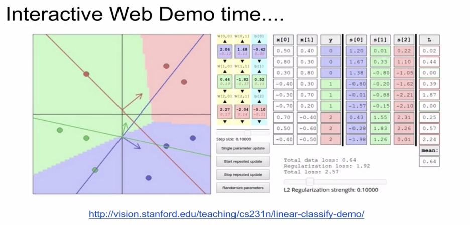 - Regularization 입장에서는 weight가 모두 0에 가깝기를 원한다.(loss 가 작아지니까) 하지만, data loss 입장에서는 weight가 0일 수는 없다.(classify를 해야하니까) 따라서, 양쪽이 서로 싸우면서 test set에 대해 좀 더 일반화된 훌륭한 결과를 낼 수 있다.