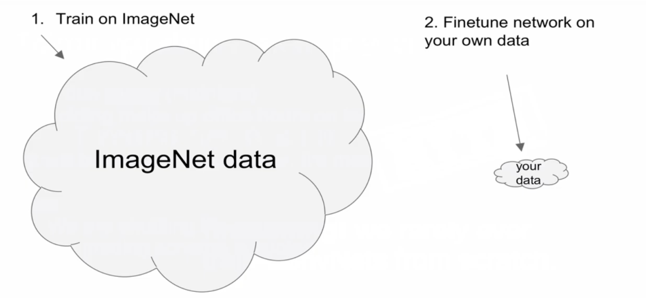 다시 말해서, 이미지넷의 데이터를 기반으로 학습시키고 우리는 이미 학습된 가중치를 가져와서 이 가중치를 우리 데이터에 finetuning 시킨다.