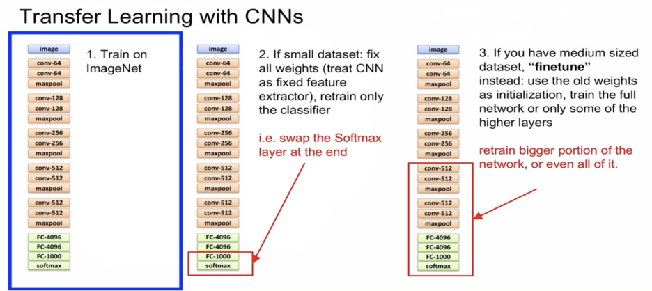 왜 ? finetuning 방법이 있어서이다. 즉, we rarely ever train ConvNets from scratch.