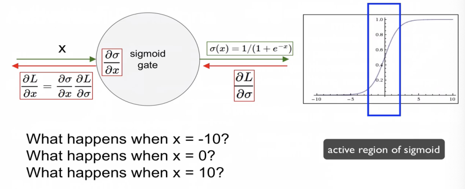 즉, x의 값이 작거나 큰 경우에 local gradient 값이 꽤 작거나 큰 경우에는 local gradient가 0이라는 값을 가지게 되므로 gradient가 없어진다(backpropagation이 stop되는 결과가 나온다.)