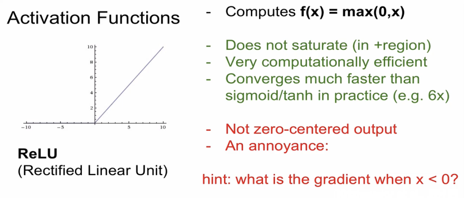 x가 양수인 지점에서는 saturation 발생하지 않는다. 기울기가 1이 되기 때문에 연산이 매우 효율적이고,