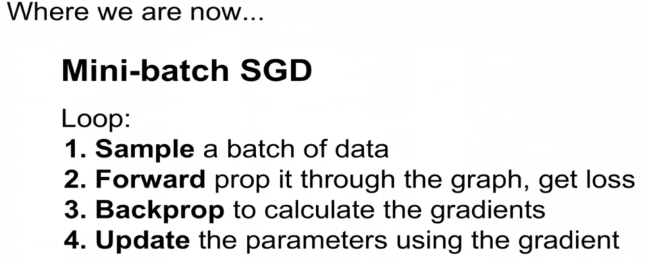 데이터에서 샘플링(128, 256 데이터 선택) > Forward를 통해 Loss를 구하고 > Backpropagation통해서 gradient를 구하고 > 구해진 gradient를 기반으로 parameter 업데이트를 해준다.