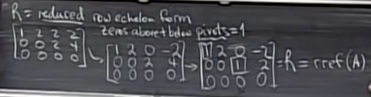 제거 방법을 계속 사용함으로써 U를 reduced row echelon form(rref 형태)의 행렬 R로 변환할 수 있으며, pivot은 1이고pivot 원소들의 아래,위로 모두 0이 된다.