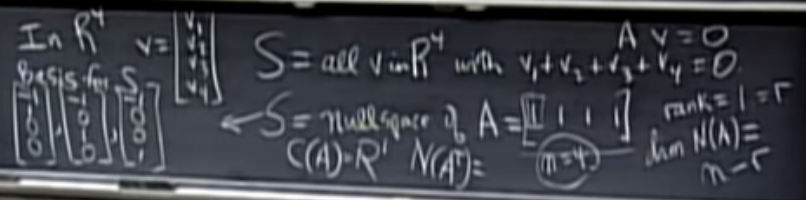 A는 rank1을 가지며, nullspace의 차원은 n - r = 3이다. 왼쪽 nullspace는 zero vector만을 포함하고, 차원은 0을 가지며, 기저(basis)는 빈 집합입니다. A의 행 공간(row space)도 차원 1을 가진다.