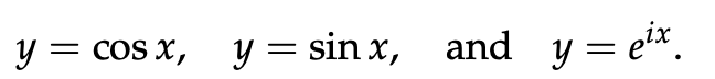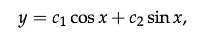 This solution space is a two dimensional vector space with basis vectors cos x and sin x. (Even though these don’t “look like” vectors, we can build a vector space from them because they can be added and multiplied by a constant.)