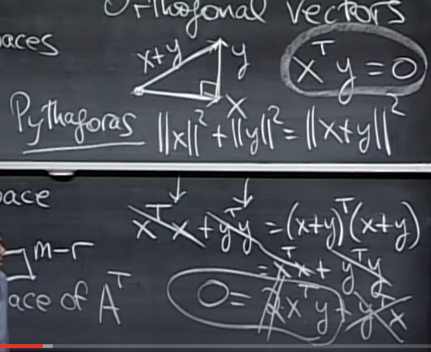 피타고라스 정리(Pythagorean theorem)에 의해 ||x||2 + |y||2 = |x+y||2이다. 또한 xT y = yT x 는 0이다.