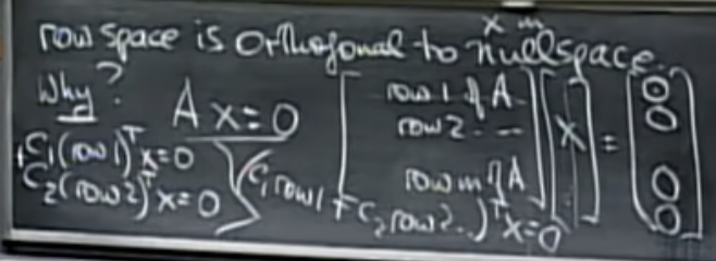 Ax=0은 각 행이 0인 x의 점(dot) 곱을 의미하기 때문에 행렬의 행(row) 공간은 nullspace와 직교한다.