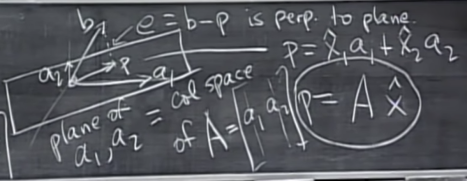 R3에서 벡터 b를 평면에서 가장 가까운 점 p에 투영하는 방법은 아래와 같다. a1과 a2가 평면의 기저를 이룬다면, 그 평면은 행렬 A = [a1 a2]의 열 공간이다. e = b-p = b-Ax ˆ는 수직이다.