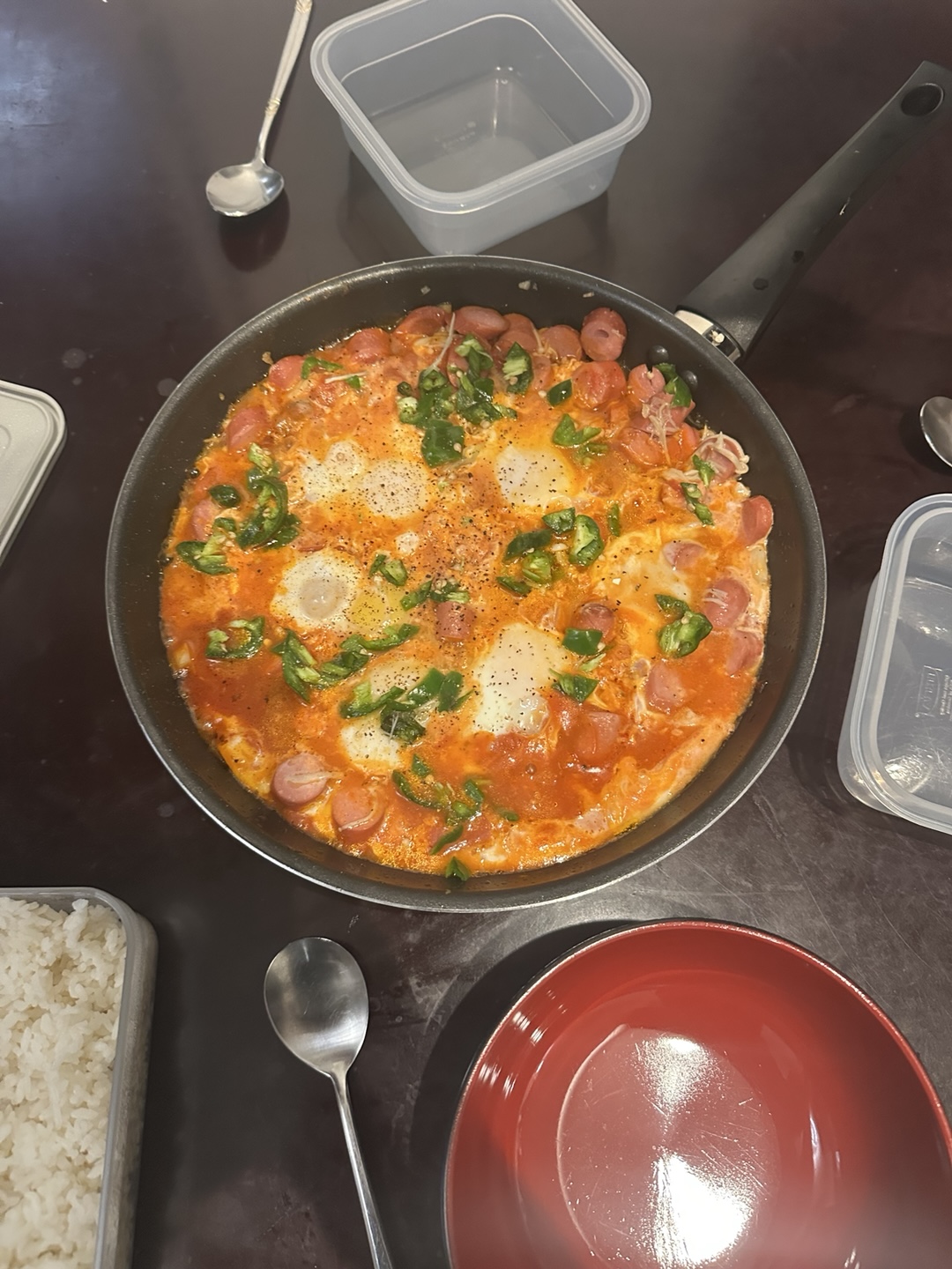 재료는 토마토소스, 계란, 고추, 소세지.. 등?