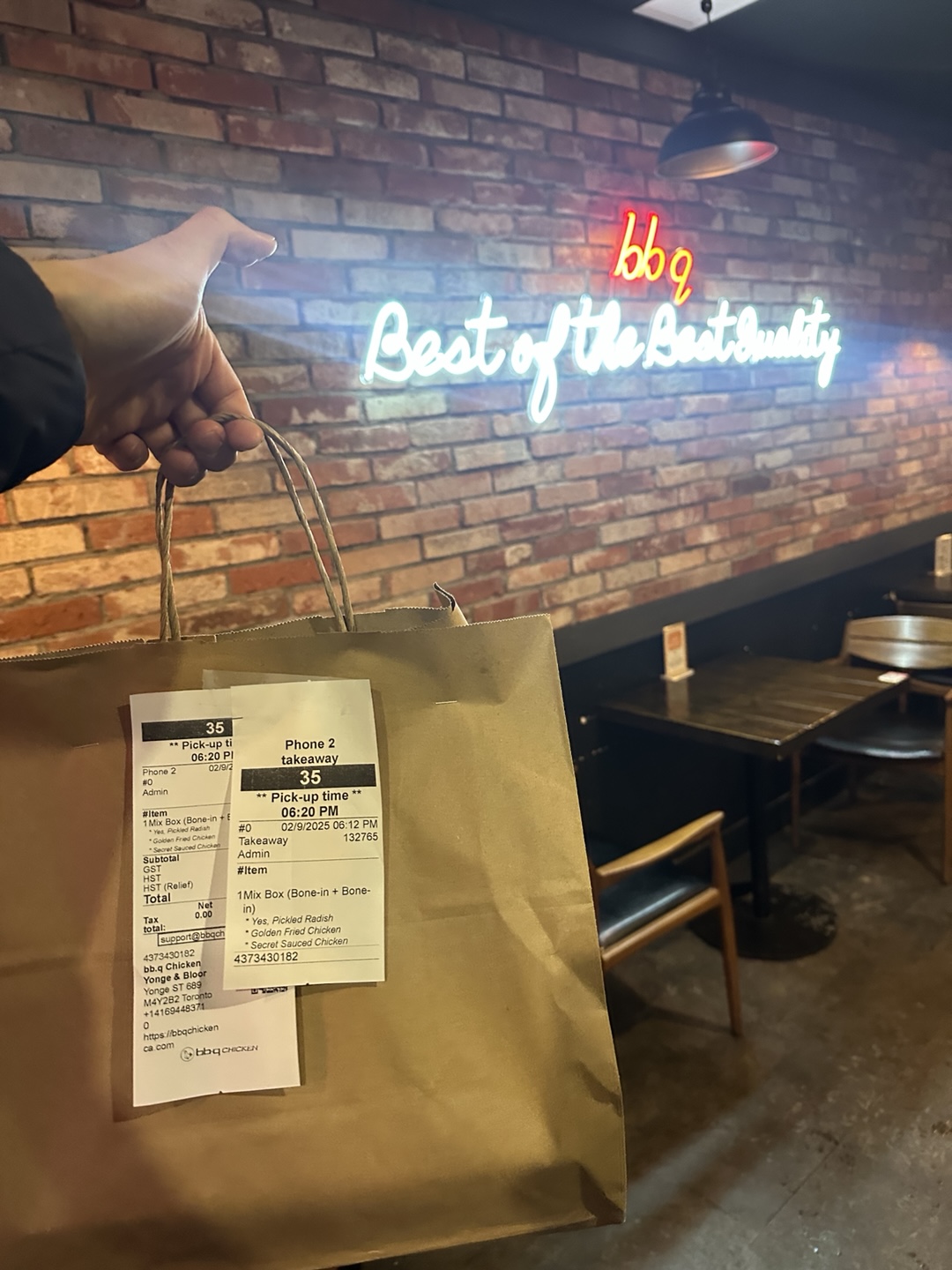 저랑 박사 동생은 비비큐 픽업했고, 다른 박사 동생은 pizza pizza를 주문하러 갔습니다.