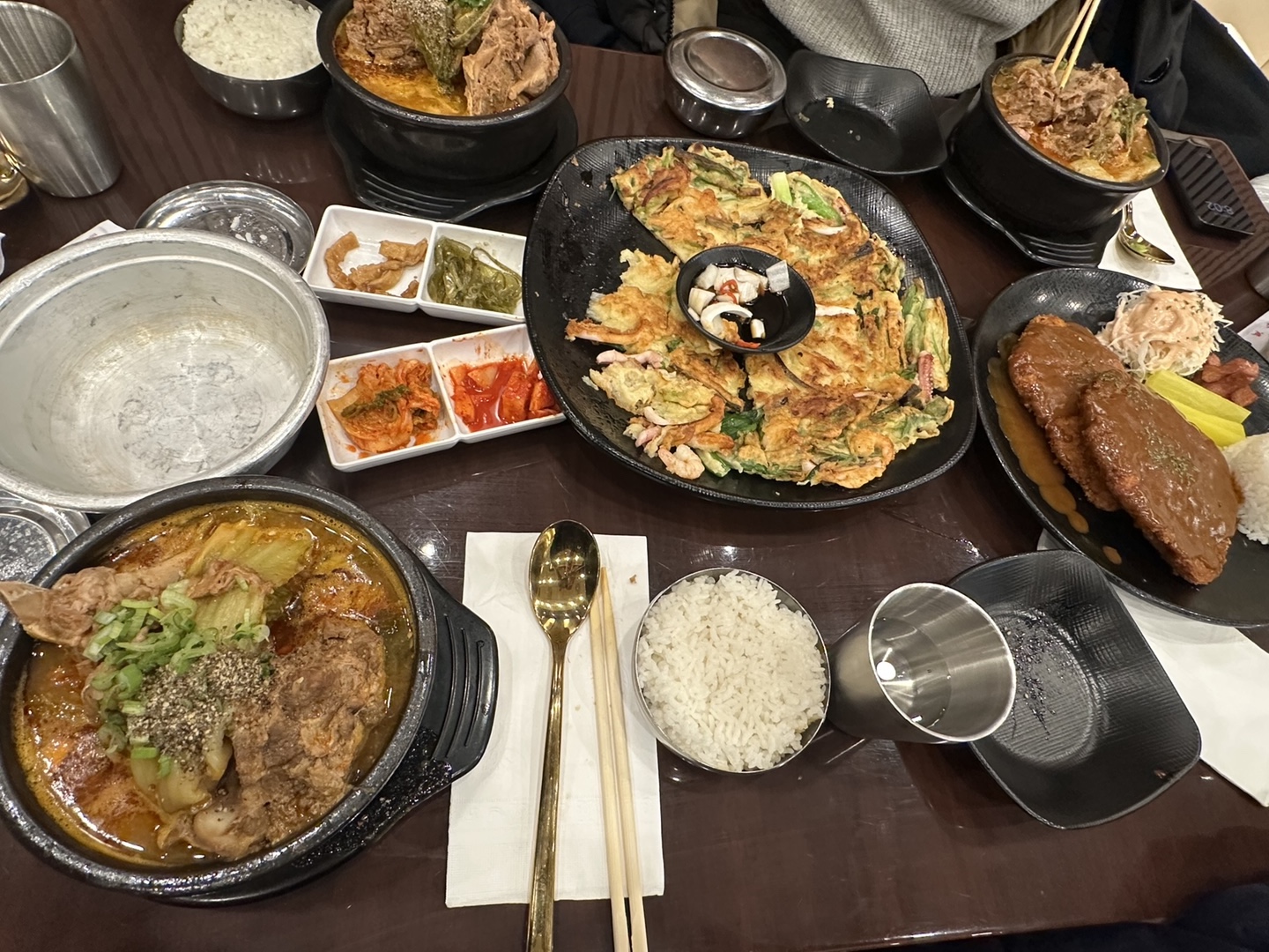 저희가 시킨 음식은 개인 감자탕, 해물파전, 돈까스 입니다! 양이 참 많죠? 동생들이 파전과 돈까스는 생일 선물로 사주었어요!