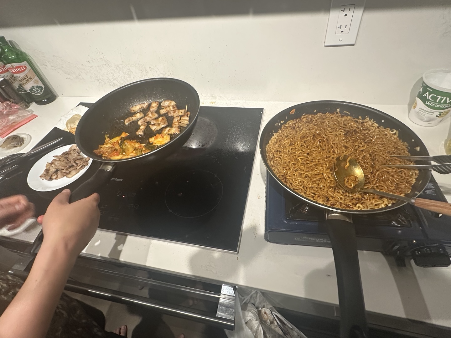 저녁에는 몸보신 해야한다며 장신 동생이 삼겹살 김치찌개와 제육볶음을 해주었습니다.