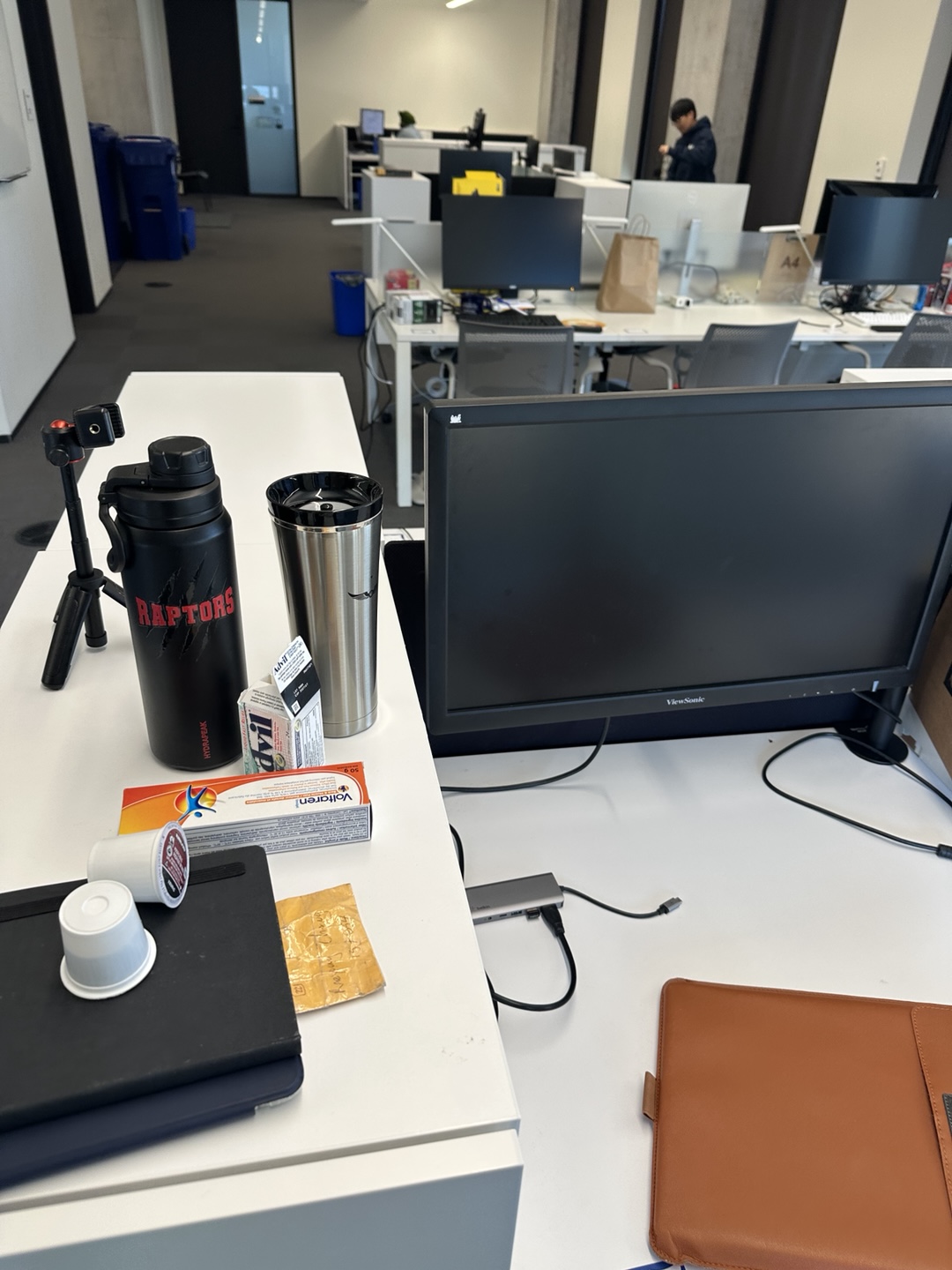 물품은 바르는 약과 복용 약은 어깨를 위한 진통제+소염제, 검정색 물통은 물, 스테인레스 물통은 커피용입니다.
